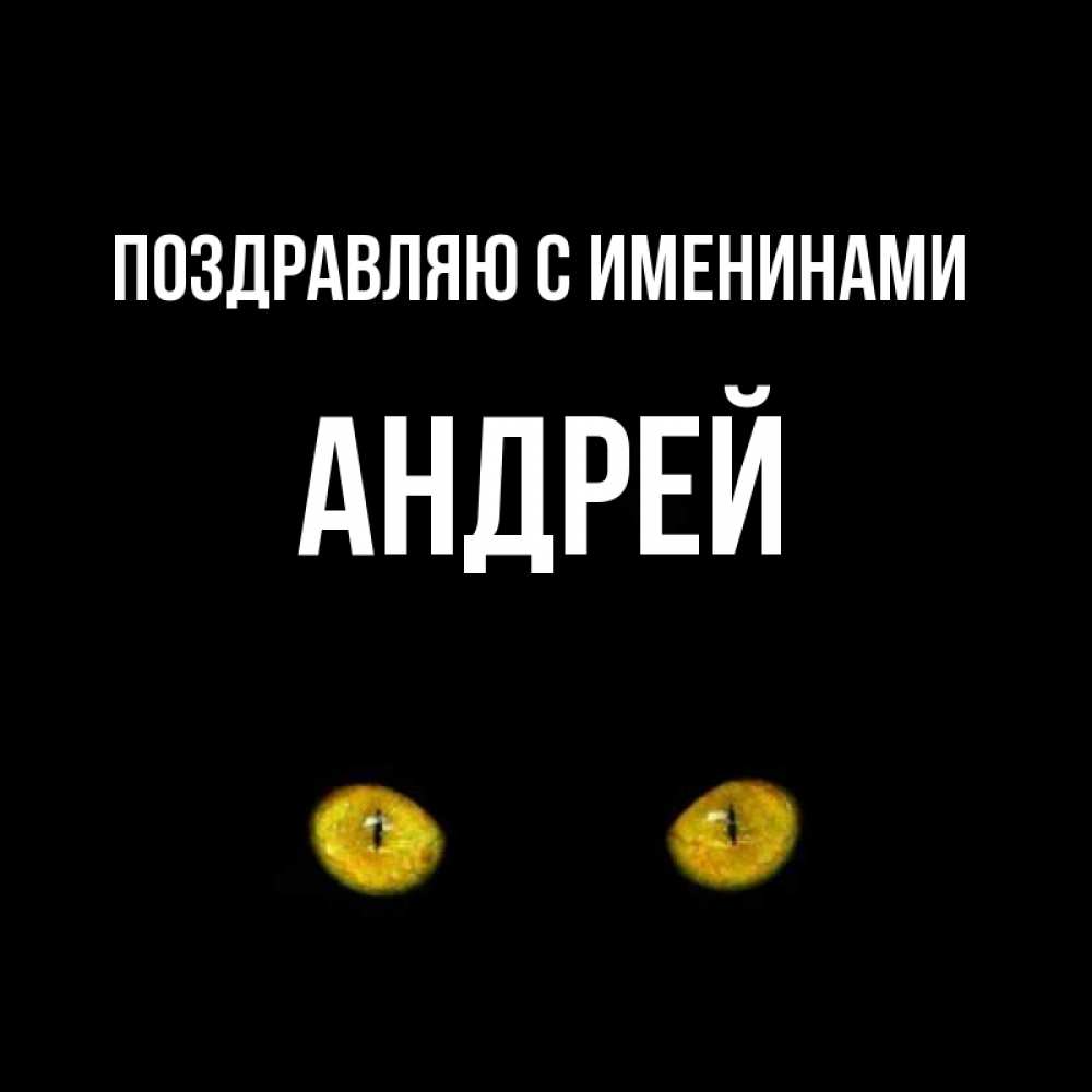 Открытка Поздравляю с именинами Андрей. Карие глаза кота на черном фоне. сладких снов бесстрашный мой дружочек