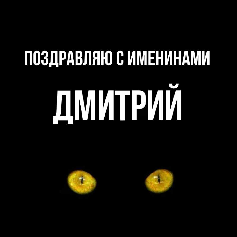 Открытка Поздравляю с именинами Дмитрий. Карие глаза кота на черном фоне. сладких снов бесстрашный мой дружочек
