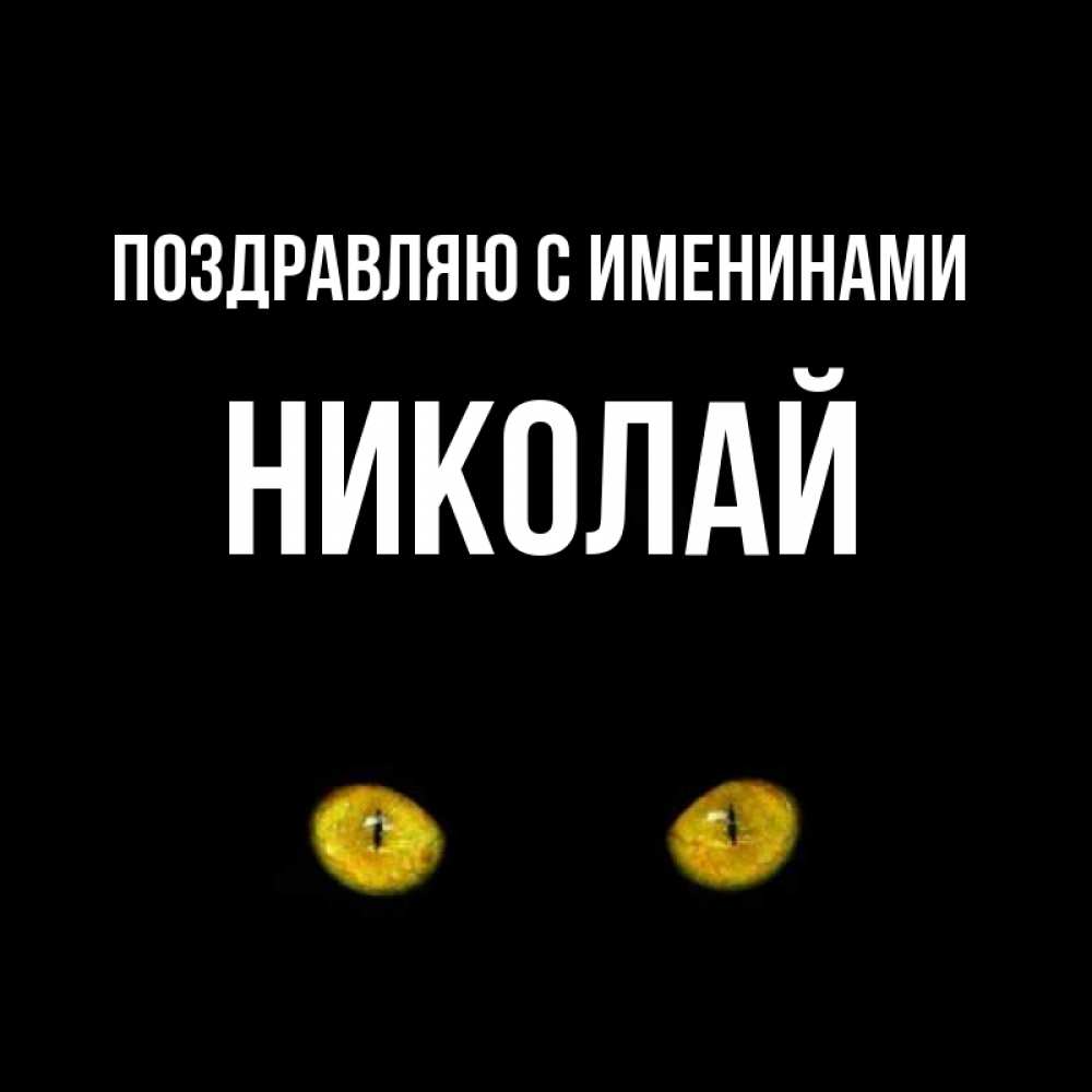Открытка Поздравляю с именинами Николай. Карие глаза кота на черном фоне. сладких снов бесстрашный мой дружочек