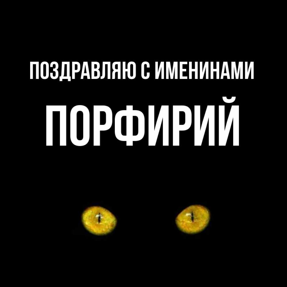 Открытка Поздравляю с именинами Порфирий. Карие глаза кота на черном фоне. сладких снов бесстрашный мой дружочек