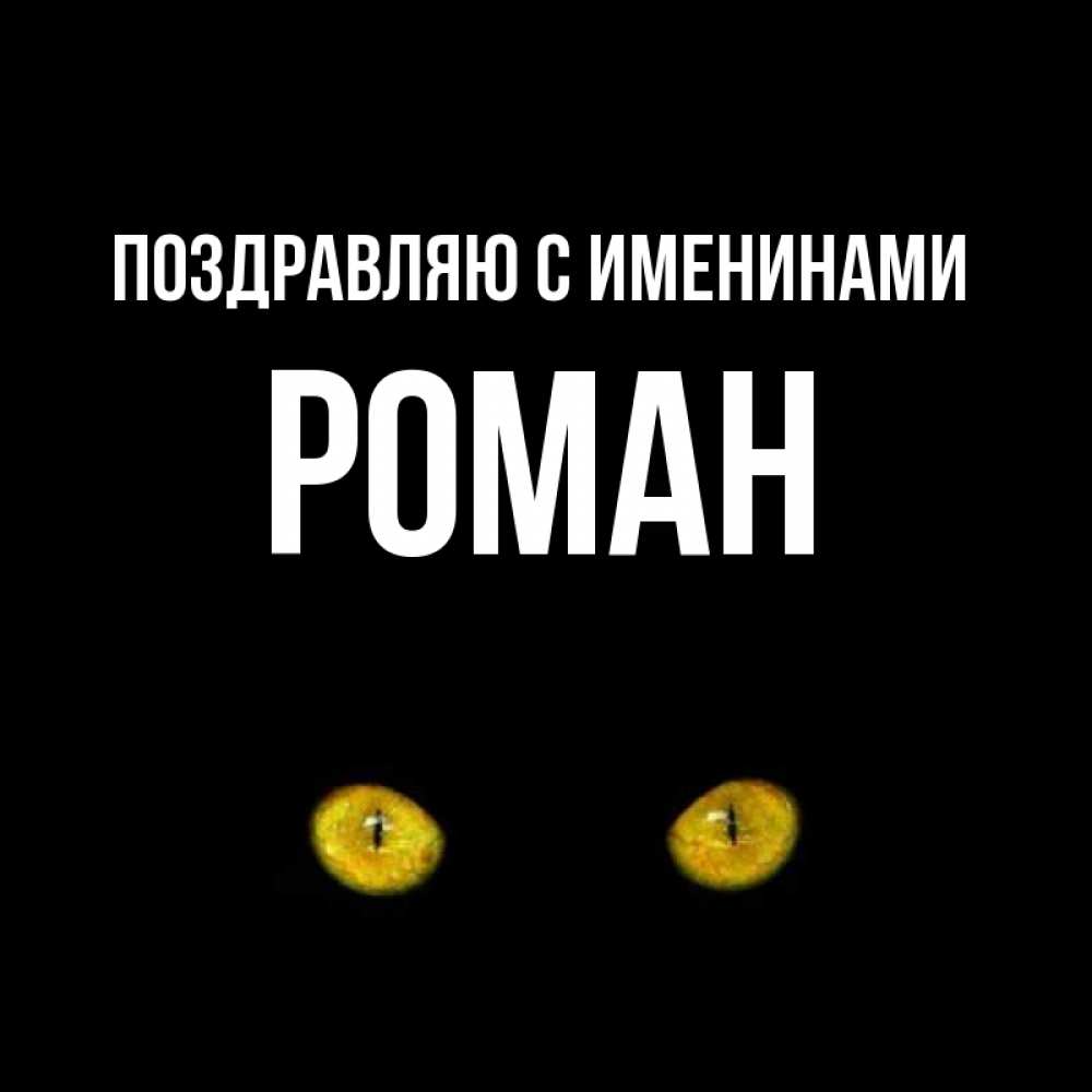 Открытка Поздравляю с именинами Роман. Карие глаза кота на черном фоне. сладких снов бесстрашный мой дружочек