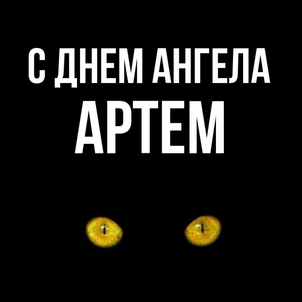 Открытка С днем Ангела Артем. Карие глаза кота на черном фоне. сладких снов бесстрашный мой дружочек