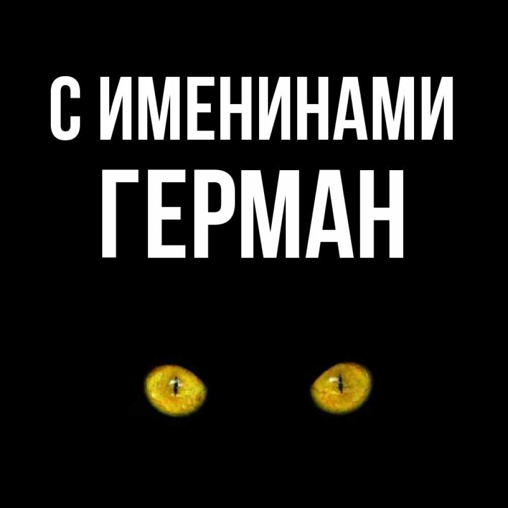 Открытка С именинами Герман. Карие глаза кота на черном фоне. сладких снов бесстрашный мой дружочек