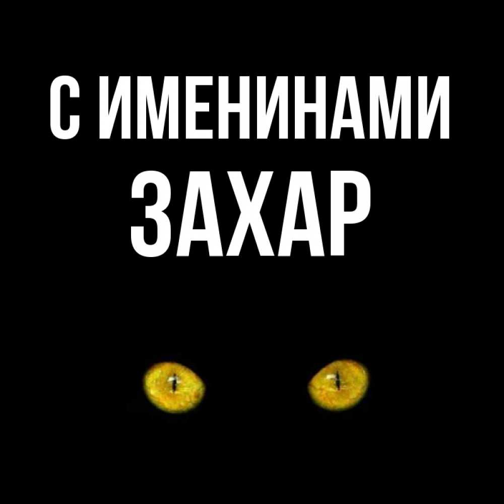 Открытка С именинами Захар. Карие глаза кота на черном фоне. сладких снов бесстрашный мой дружочек