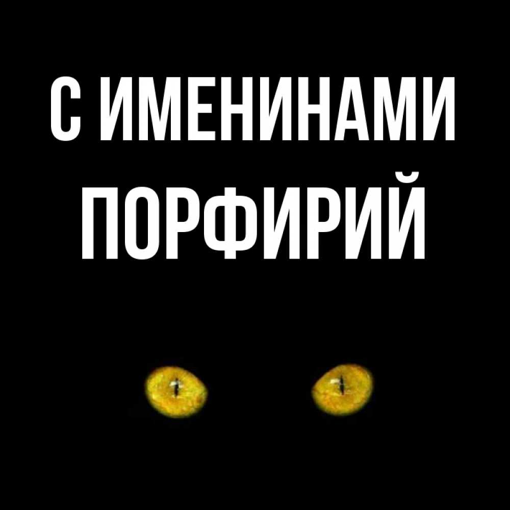 Открытка С именинами Порфирий. Карие глаза кота на черном фоне. сладких снов бесстрашный мой дружочек