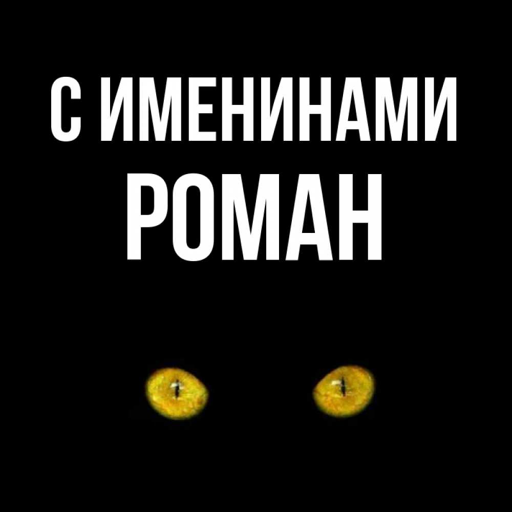 Открытка С именинами Роман. Карие глаза кота на черном фоне. сладких снов бесстрашный мой дружочек