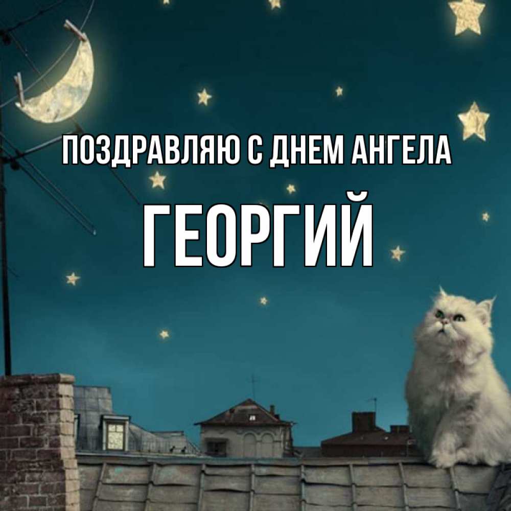 Открытка Поздравляю с днем Ангела Георгий. Кот смотрит на луну которую прикрепили прищепками. белый кот сидит на крыше