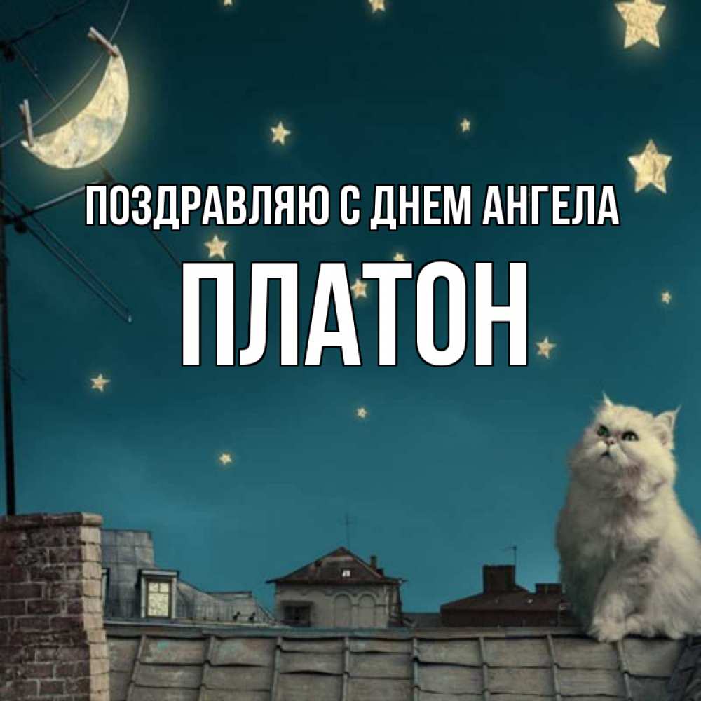 Открытка Поздравляю с днем Ангела Платон. Кот смотрит на луну которую прикрепили прищепками. белый кот сидит на крыше
