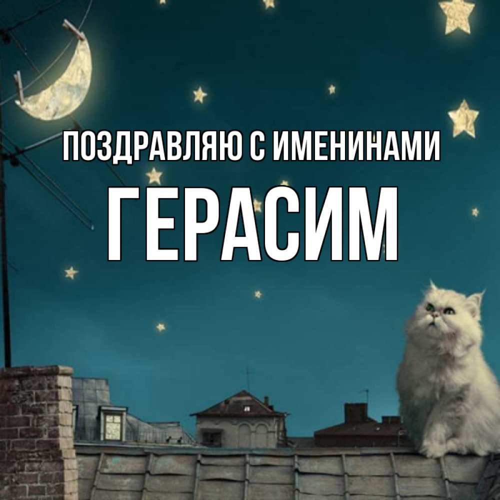 Открытка Поздравляю с именинами Герасим. Кот смотрит на луну которую прикрепили прищепками. белый кот сидит на крыше