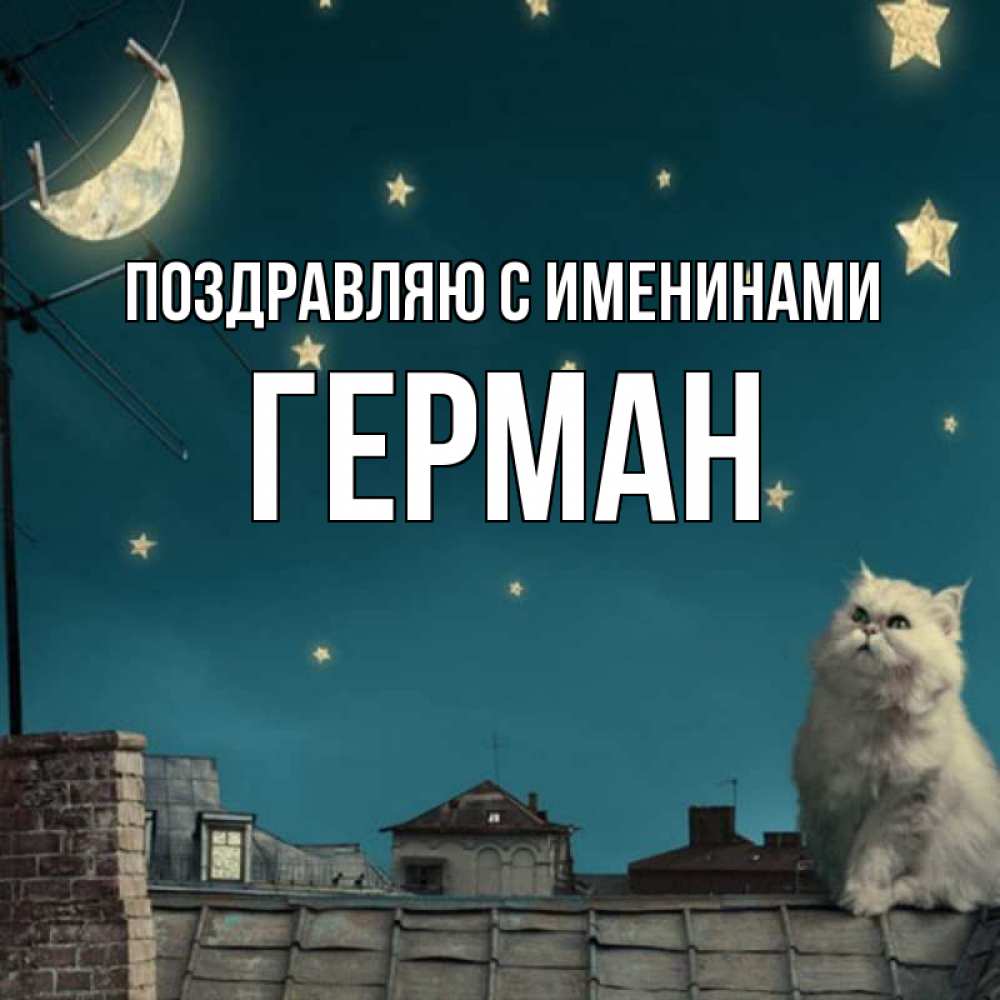 Открытка Поздравляю с именинами Герман. Кот смотрит на луну которую прикрепили прищепками. белый кот сидит на крыше