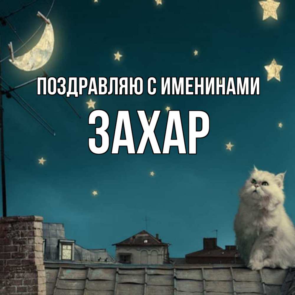 Открытка Поздравляю с именинами Захар. Кот смотрит на луну которую прикрепили прищепками. белый кот сидит на крыше