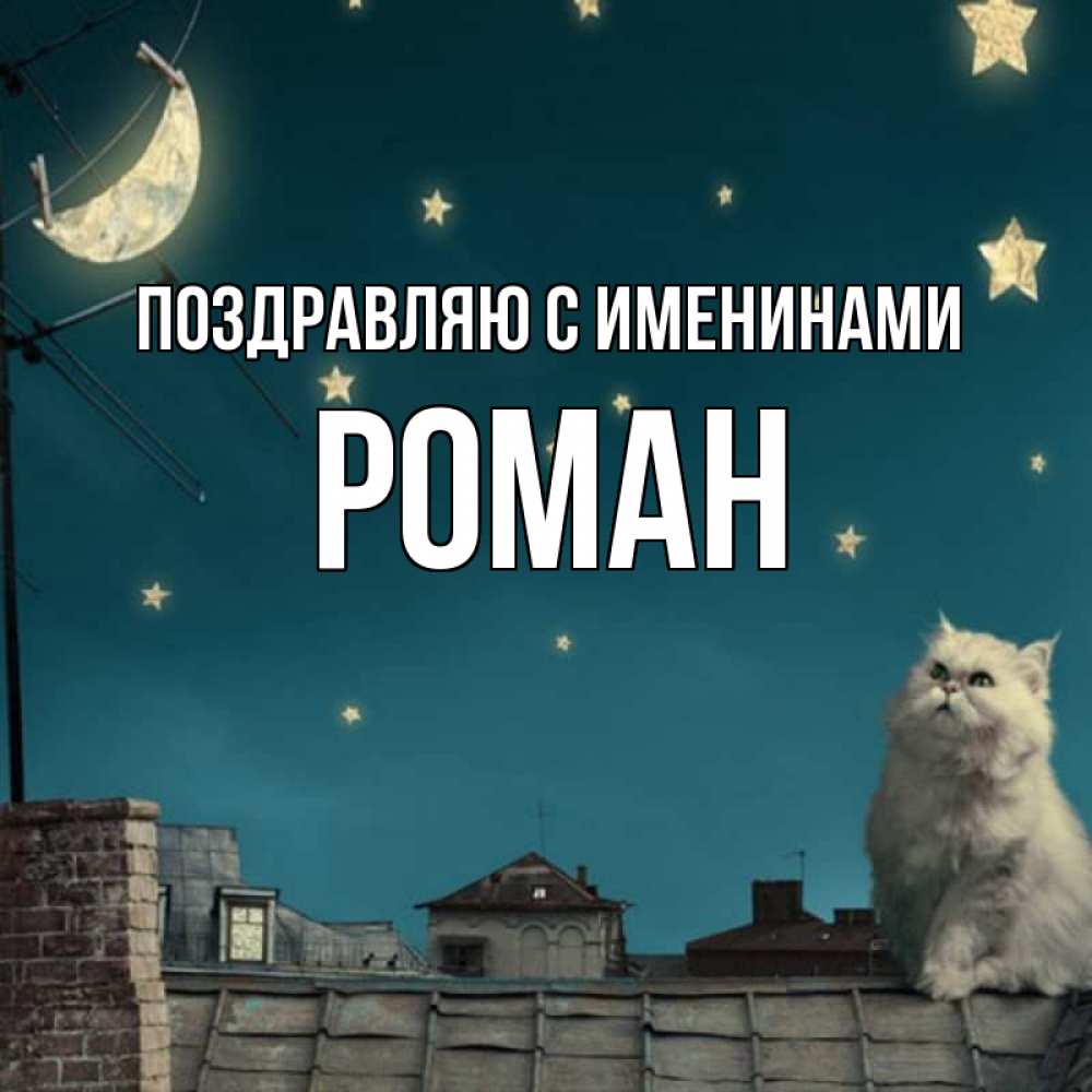 Открытка Поздравляю с именинами Роман. Кот смотрит на луну которую прикрепили прищепками. белый кот сидит на крыше
