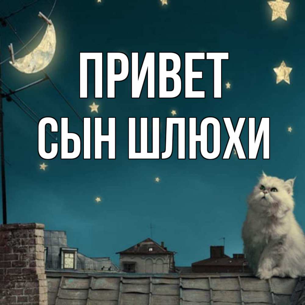 Открытка Привет Сын шлюхи. Кот смотрит на луну которую прикрепили прищепками. белый кот сидит на крыше