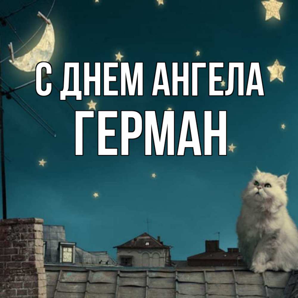 Открытка С днем Ангела Герман. Кот смотрит на луну которую прикрепили прищепками. белый кот сидит на крыше