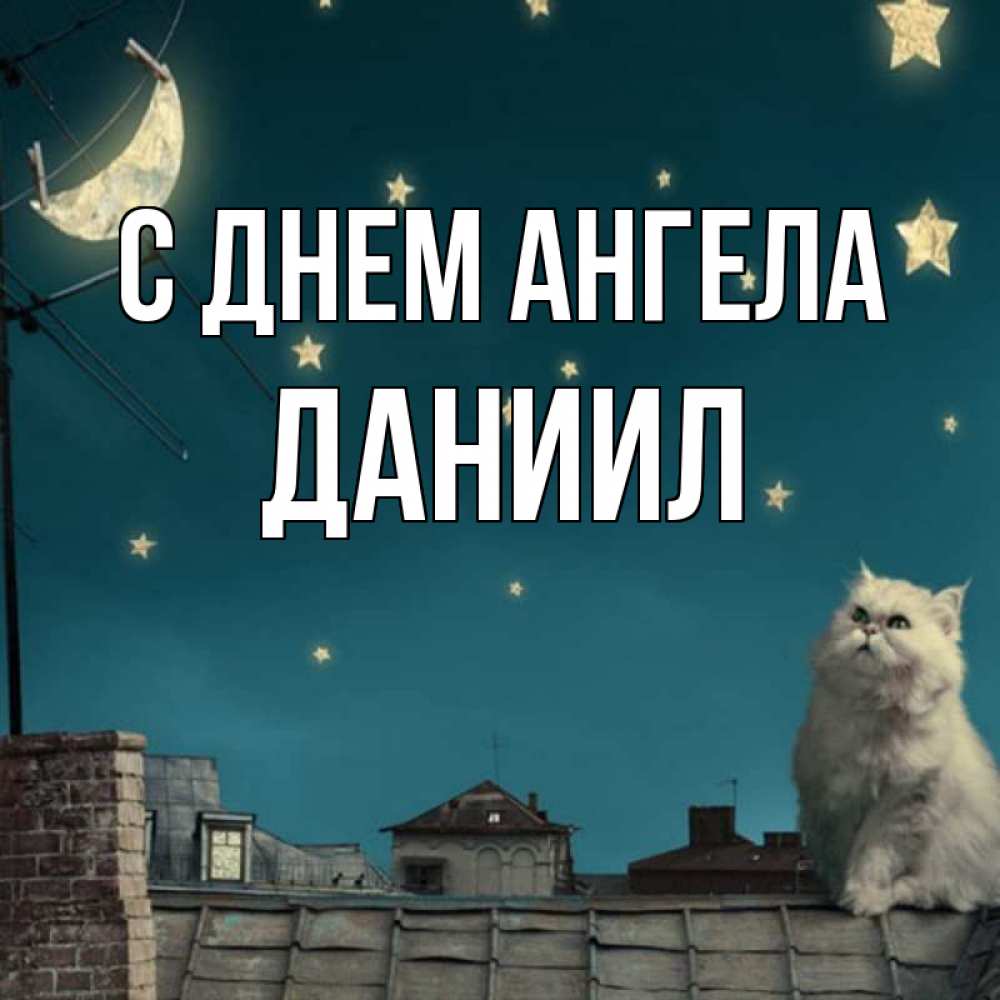 Открытка С днем Ангела Даниил. Кот смотрит на луну которую прикрепили прищепками. белый кот сидит на крыше