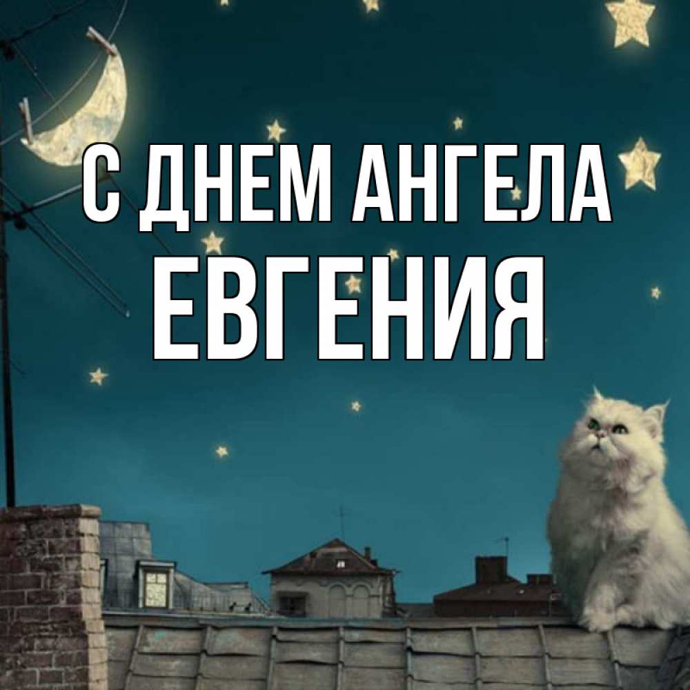 Открытка С днем Ангела Евгения. Кот смотрит на луну которую прикрепили прищепками. белый кот сидит на крыше