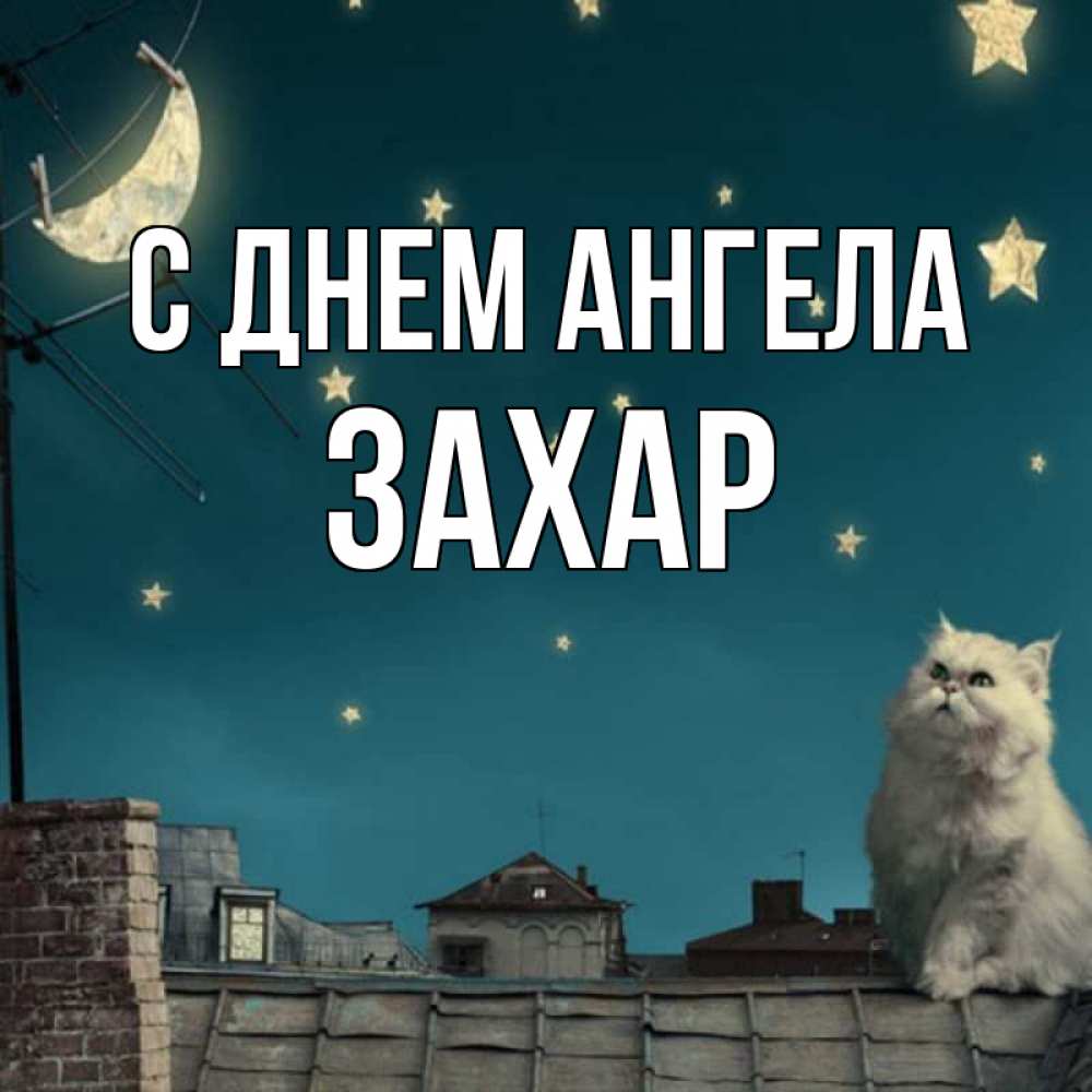 Открытка С днем Ангела Захар. Кот смотрит на луну которую прикрепили прищепками. белый кот сидит на крыше