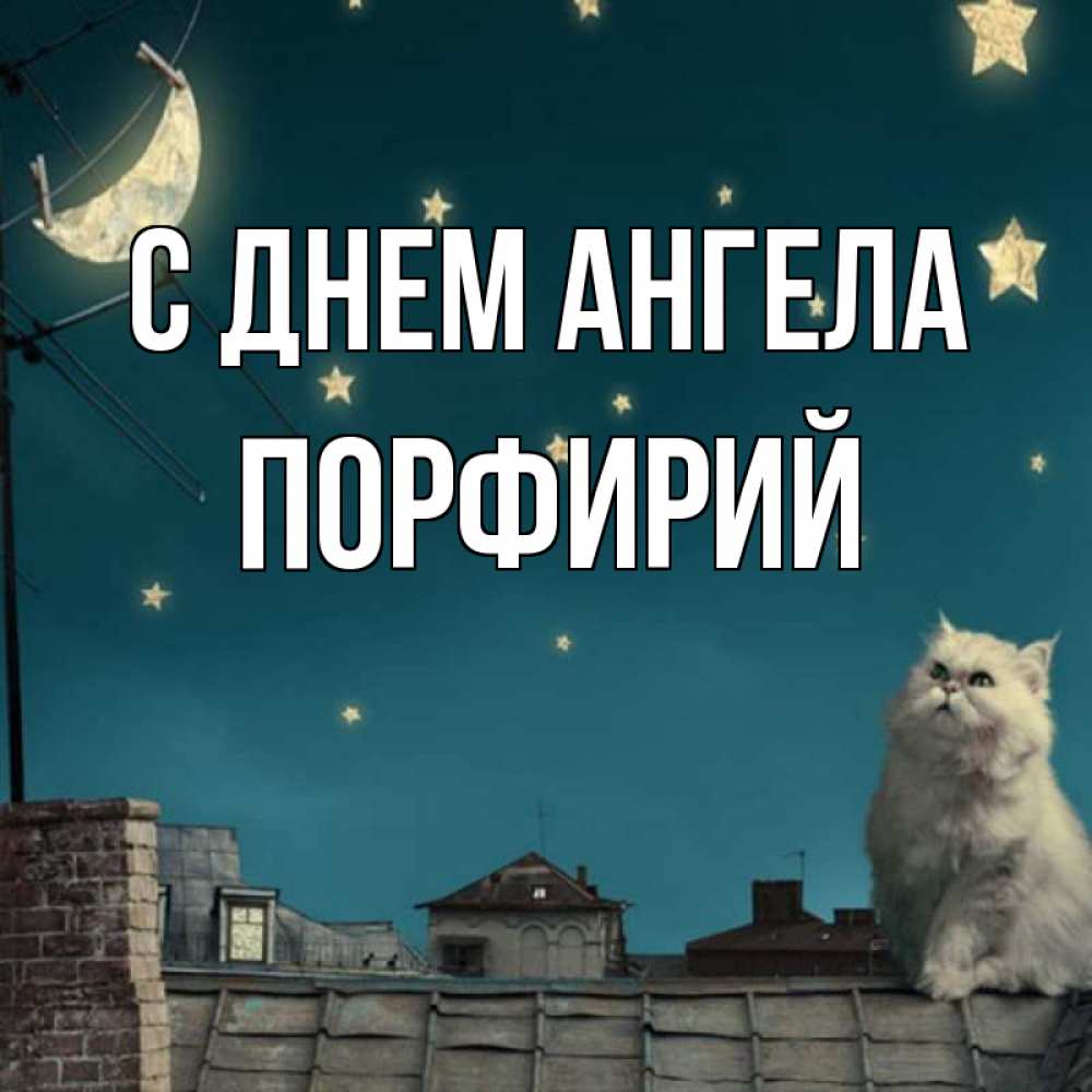 Открытка С днем Ангела Порфирий. Кот смотрит на луну которую прикрепили прищепками. белый кот сидит на крыше