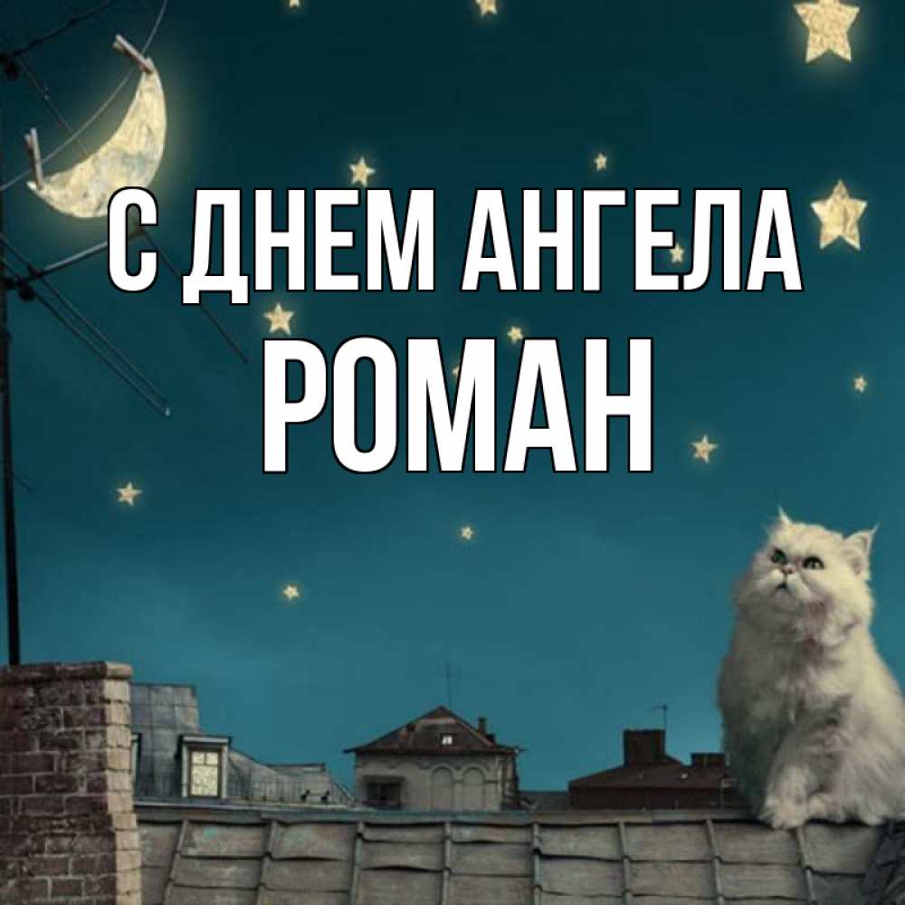 Открытка С днем Ангела Роман. Кот смотрит на луну которую прикрепили прищепками. белый кот сидит на крыше