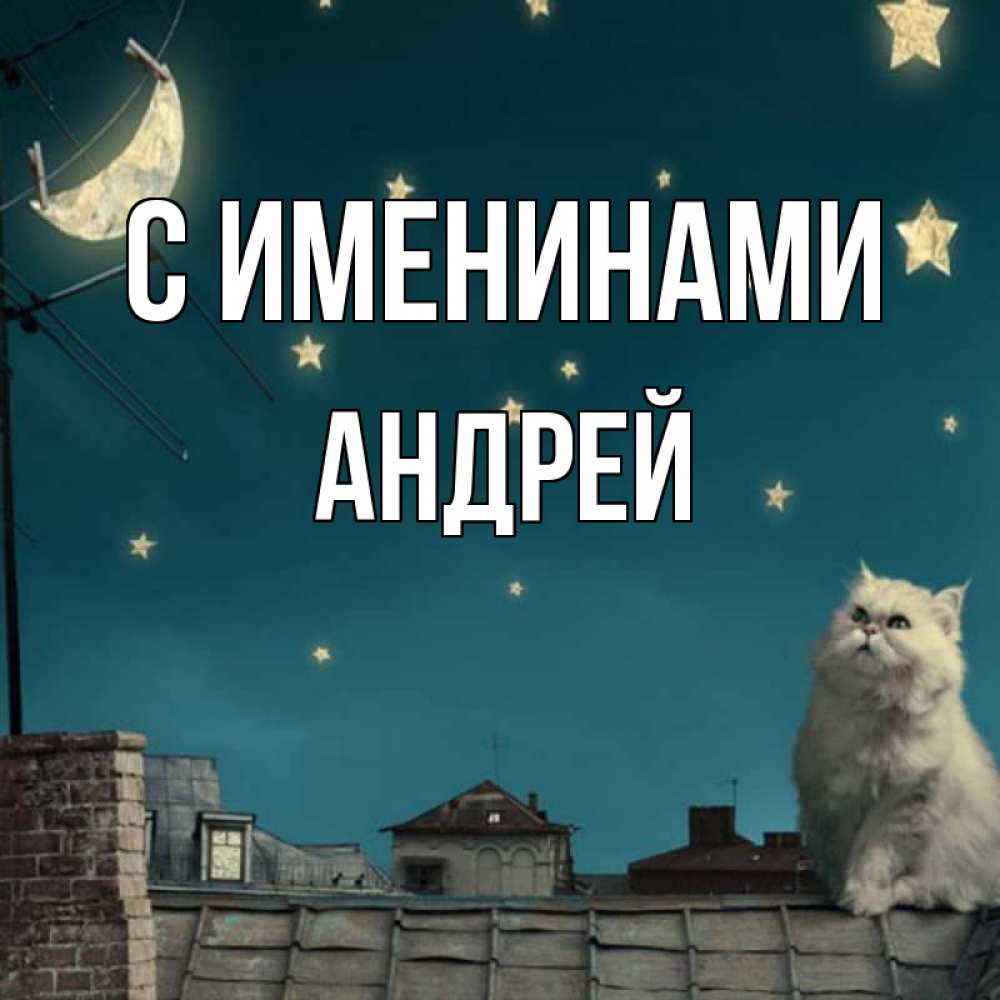 Открытка С именинами Андрей. Кот смотрит на луну которую прикрепили прищепками. белый кот сидит на крыше