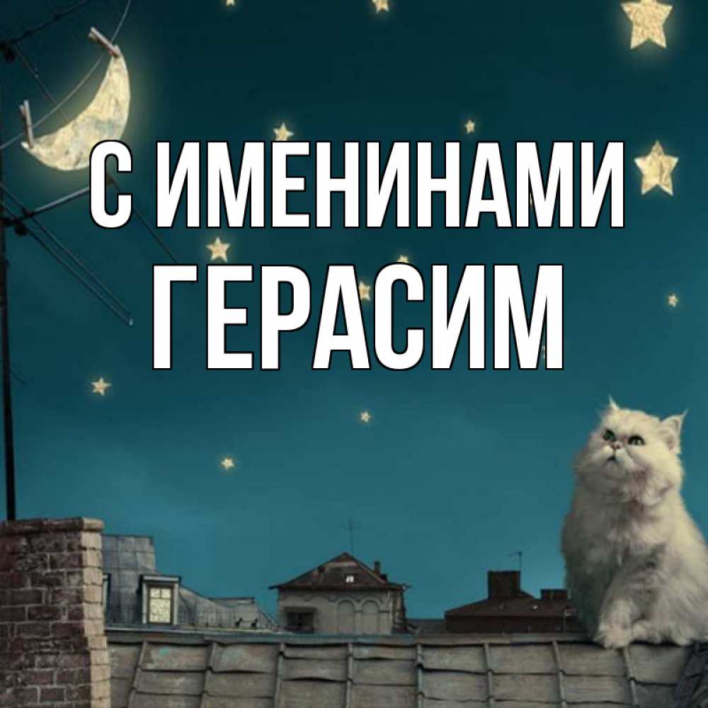 Открытка С именинами Герасим. Кот смотрит на луну которую прикрепили прищепками. белый кот сидит на крыше