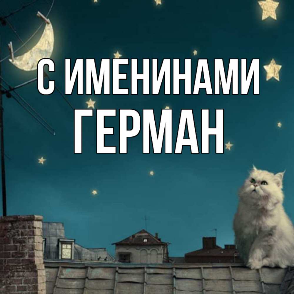 Открытка С именинами Герман. Кот смотрит на луну которую прикрепили прищепками. белый кот сидит на крыше