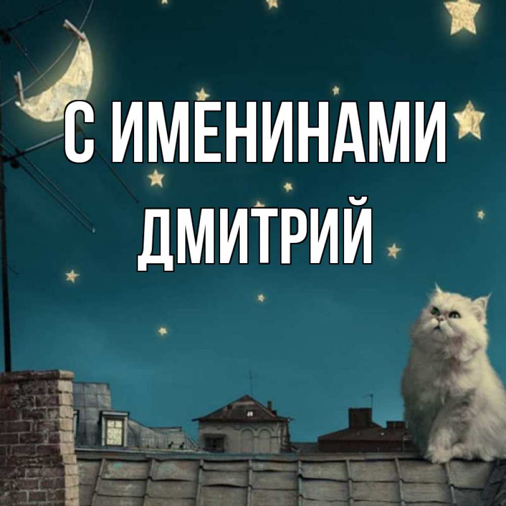 Открытка С именинами Дмитрий. Кот смотрит на луну которую прикрепили прищепками. белый кот сидит на крыше