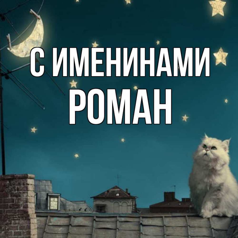 Открытка С именинами Роман. Кот смотрит на луну которую прикрепили прищепками. белый кот сидит на крыше