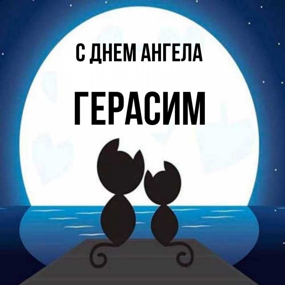 Открытка С днем Ангела Герасим. Два котика смотрят на луну сидя на мосте. луна море мост