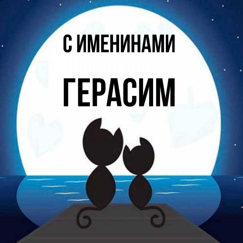 Открытка С именинами Герасим. Два котика смотрят на луну сидя на мосте. луна море мост
