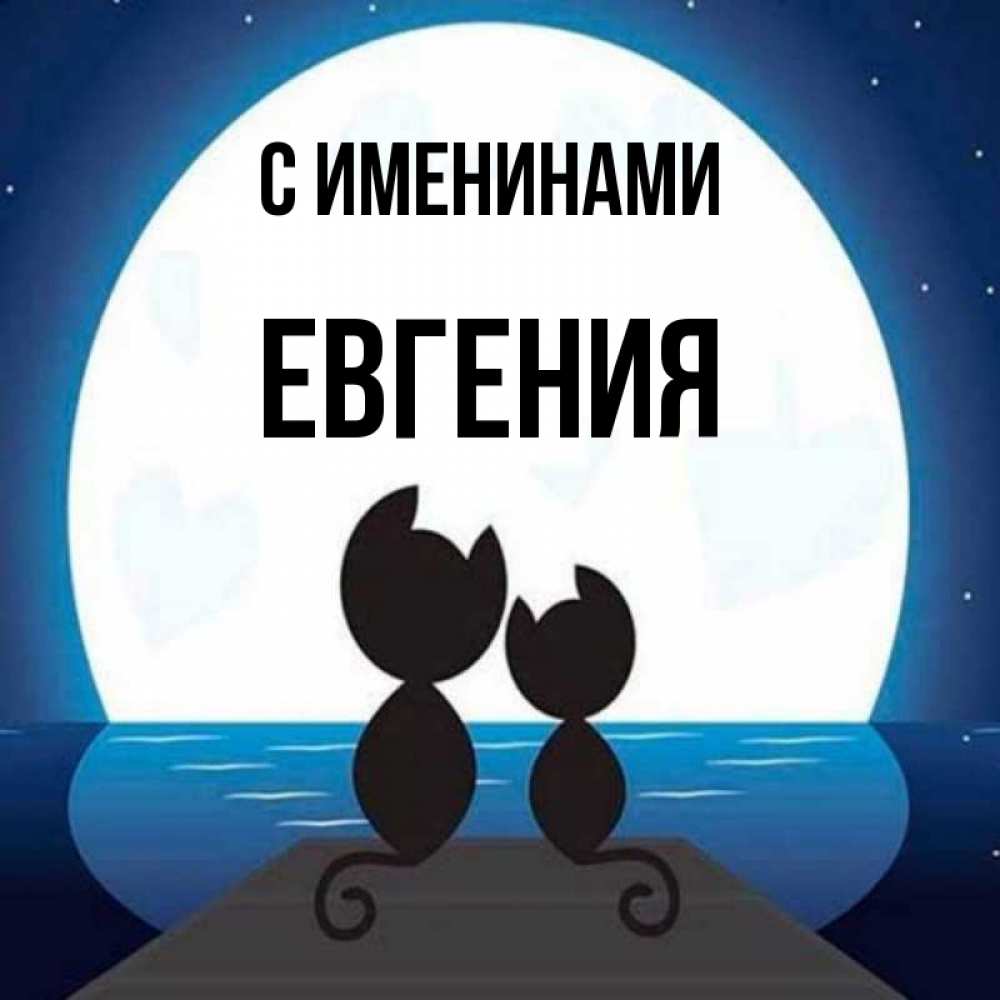 Открытка С именинами Евгения. Два котика смотрят на луну сидя на мосте. луна море мост