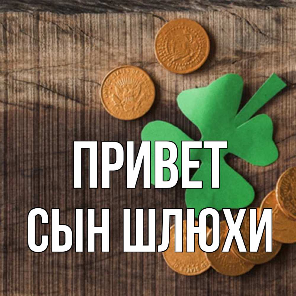 Открытка Привет Сын шлюхи. монеты и клевер на деревянном фоне. на удачу сегодня