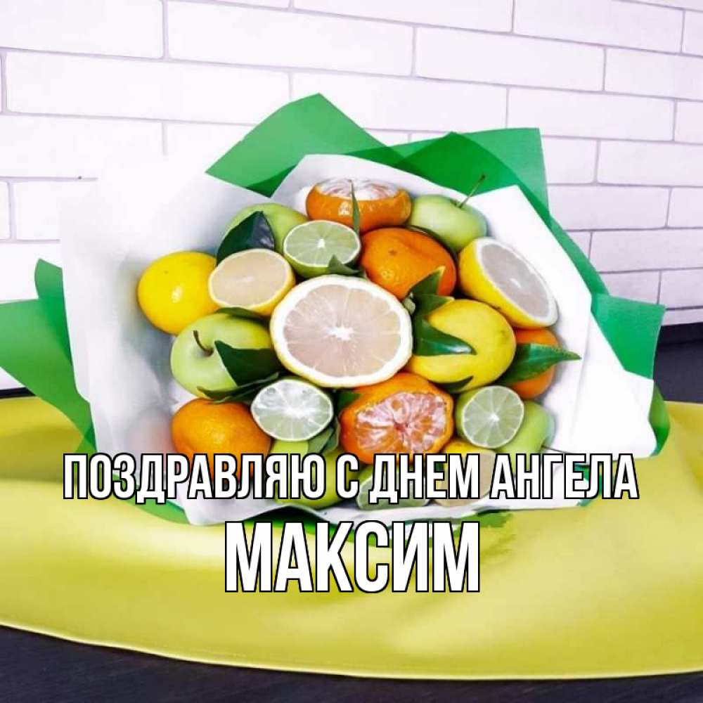Открытка Поздравляю с днем Ангела Максим. Букет из лимонов апельсинов и яблок для больного. витаминный букет из цитрусовых и яблок