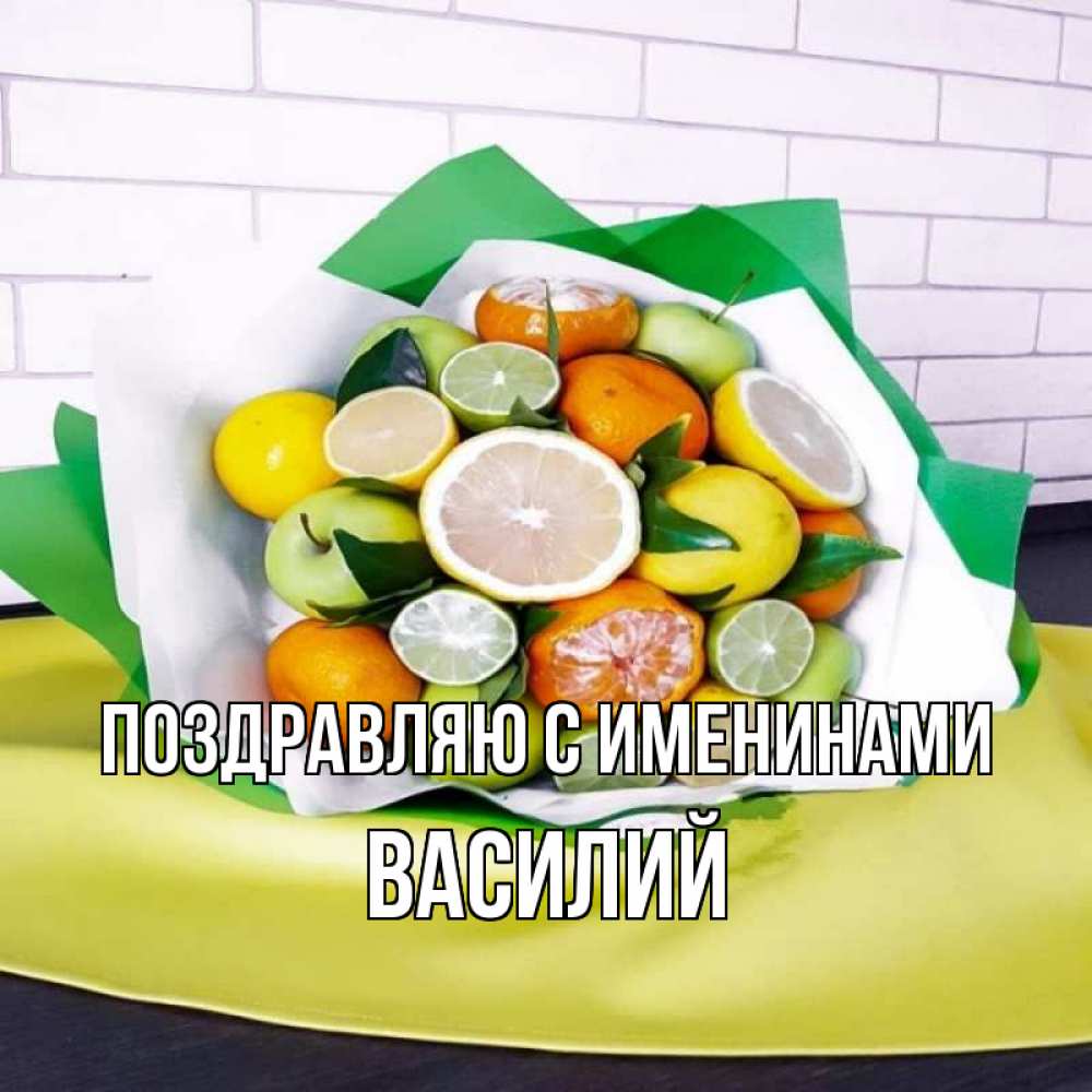 Открытка Поздравляю с именинами Василий. Букет из лимонов апельсинов и яблок для больного. витаминный букет из цитрусовых и яблок