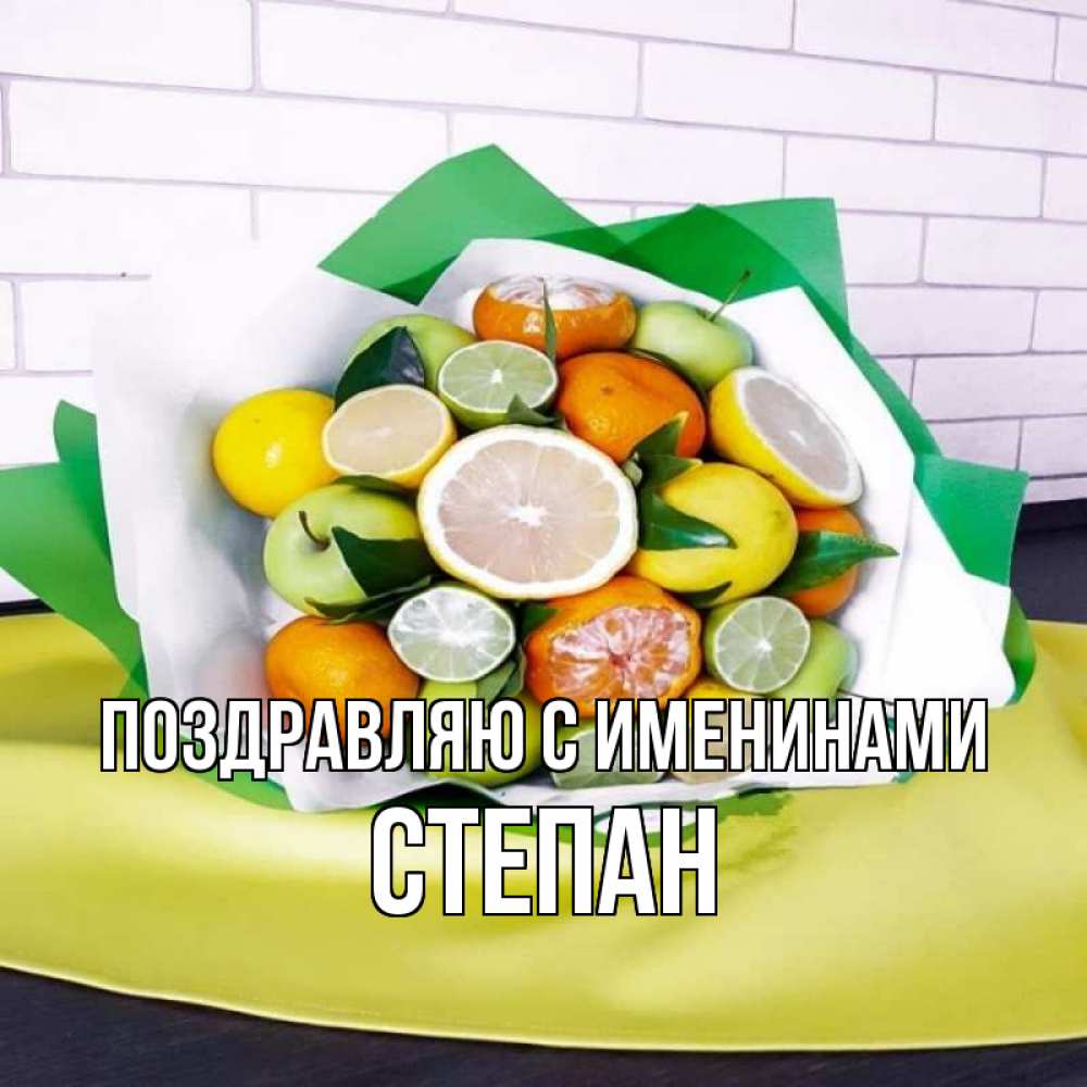 Открытка Поздравляю с именинами Степан. Букет из лимонов апельсинов и яблок для больного. витаминный букет из цитрусовых и яблок