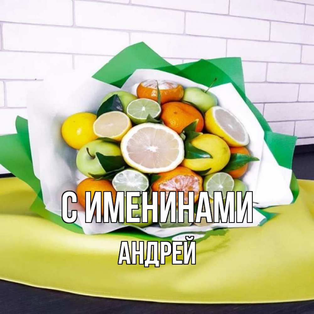 Открытка С именинами Андрей. Букет из лимонов апельсинов и яблок для больного. витаминный букет из цитрусовых и яблок