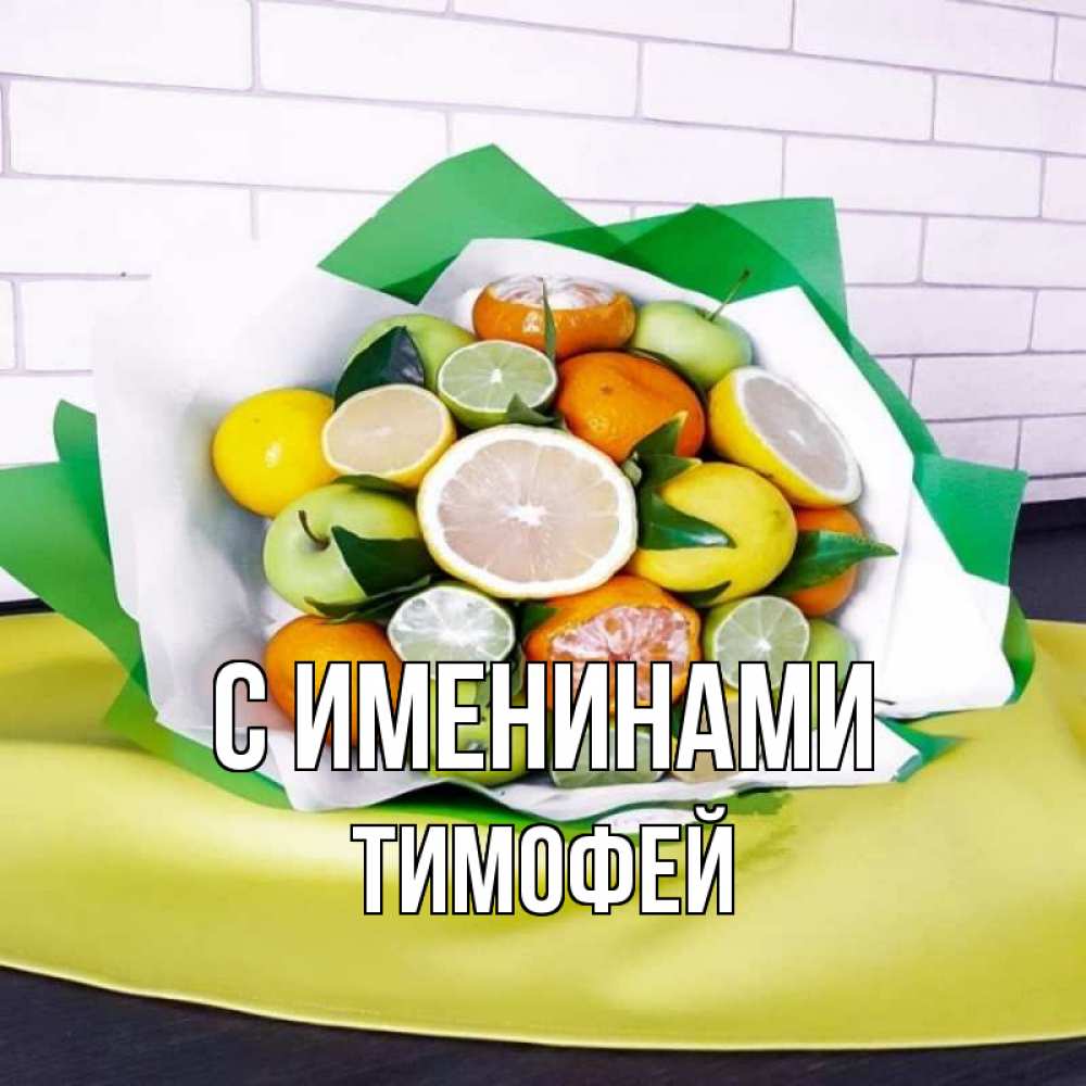 Открытка С именинами Тимофей. Букет из лимонов апельсинов и яблок для больного. витаминный букет из цитрусовых и яблок