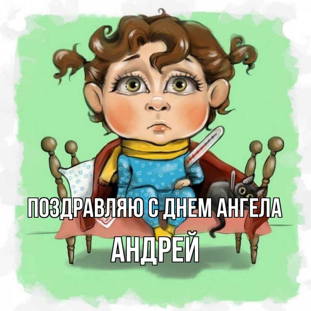 Открытка Поздравляю с днем Ангела Андрей. девочка простыла. лежит с котом и градусниками