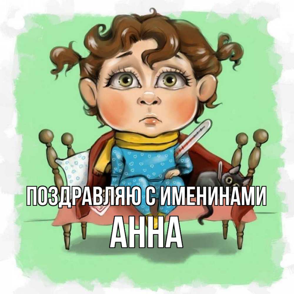 Открытка Поздравляю с именинами Анна. девочка простыла. лежит с котом и градусниками