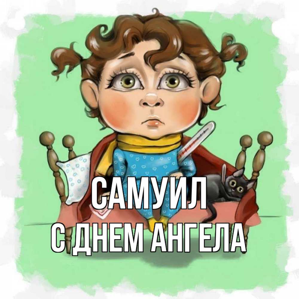 Открытка Самуил С днем ангела. девочка простыла. лежит с котом и градусниками