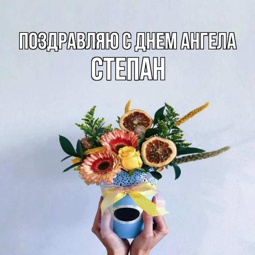 Открытка Поздравляю с днем Ангела Степан. букет для выздоровления. в руках букет полезный