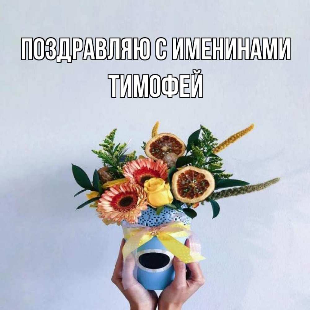 Открытка Поздравляю с именинами Тимофей. букет для выздоровления. в руках букет полезный