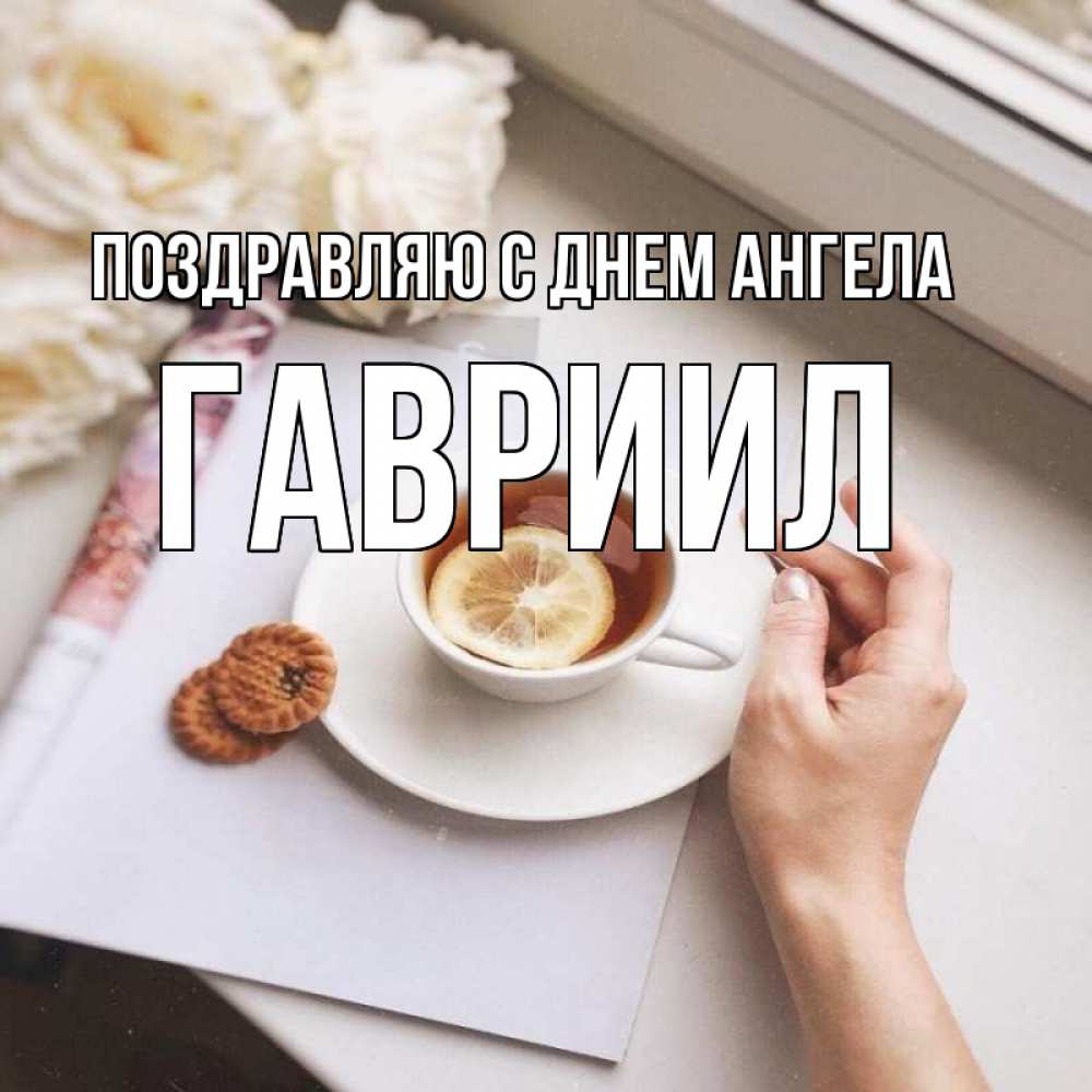 Открытка Поздравляю с днем Ангела Гавриил. чай с лимоном. и печеньками