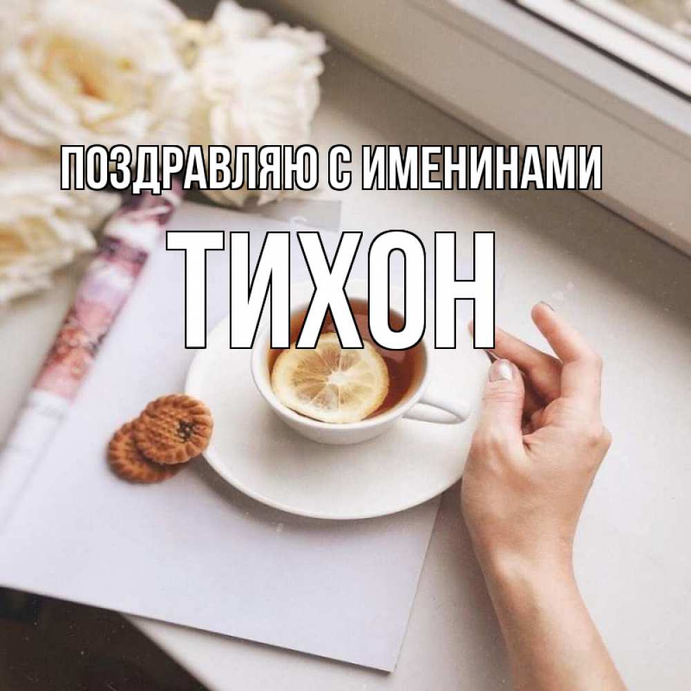 Открытка Поздравляю с именинами Тихон. чай с лимоном. и печеньками