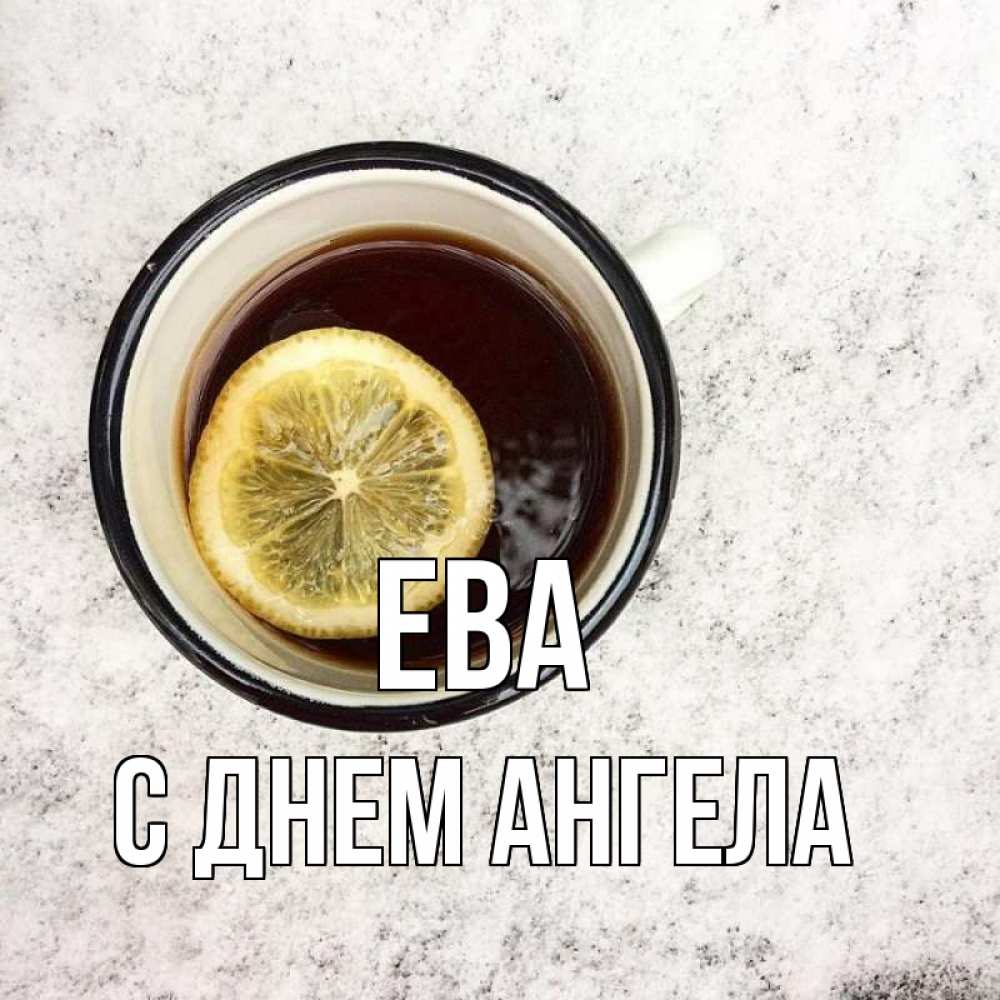 Открытка Ева С днем ангела. кружка чая и лимон. на мраморном столе