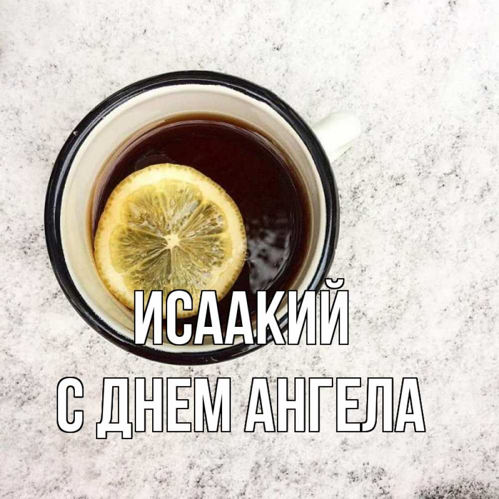 Открытка Исаакий С днем ангела. кружка чая и лимон. на мраморном столе