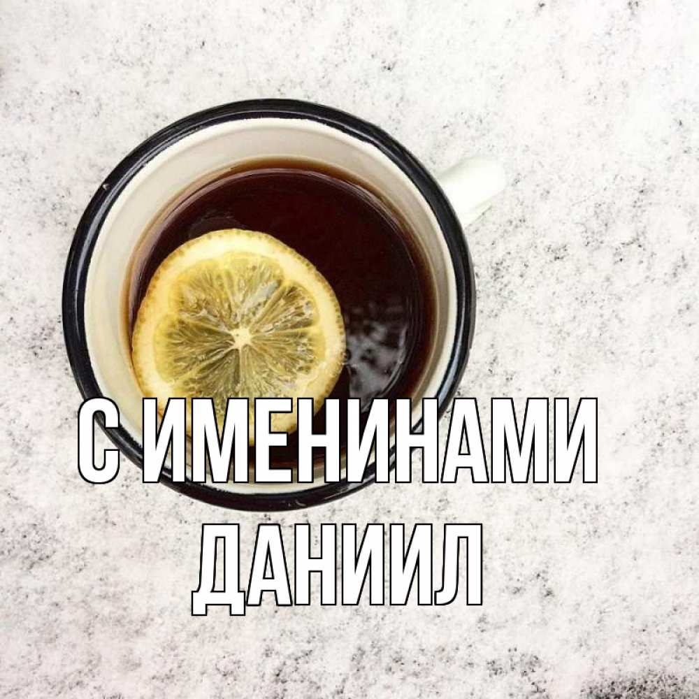 Открытка С именинами Даниил. кружка чая и лимон. на мраморном столе