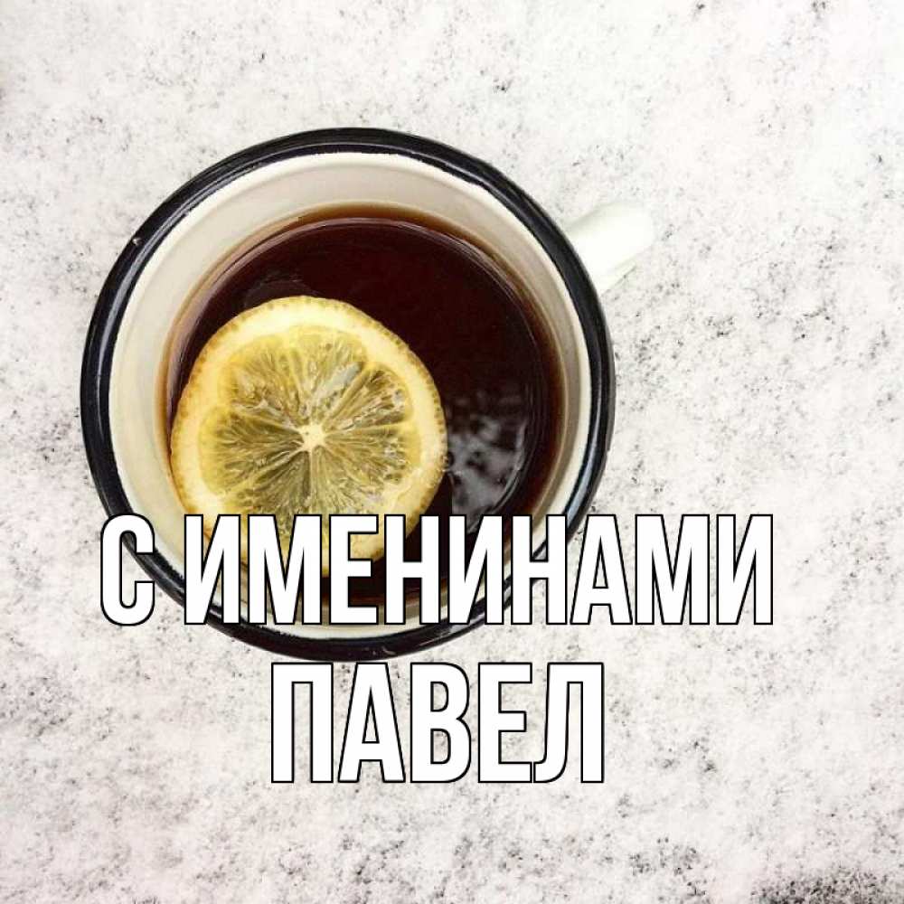 Открытка С именинами Павел. кружка чая и лимон. на мраморном столе