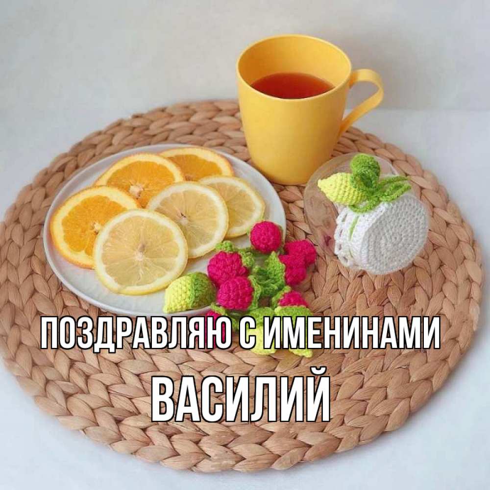 Открытка Поздравляю с именинами Василий. чай и лимон. вязаные штучки