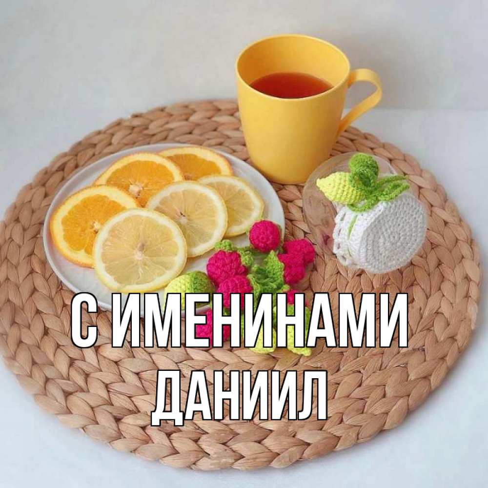 Открытка С именинами Даниил. чай и лимон. вязаные штучки
